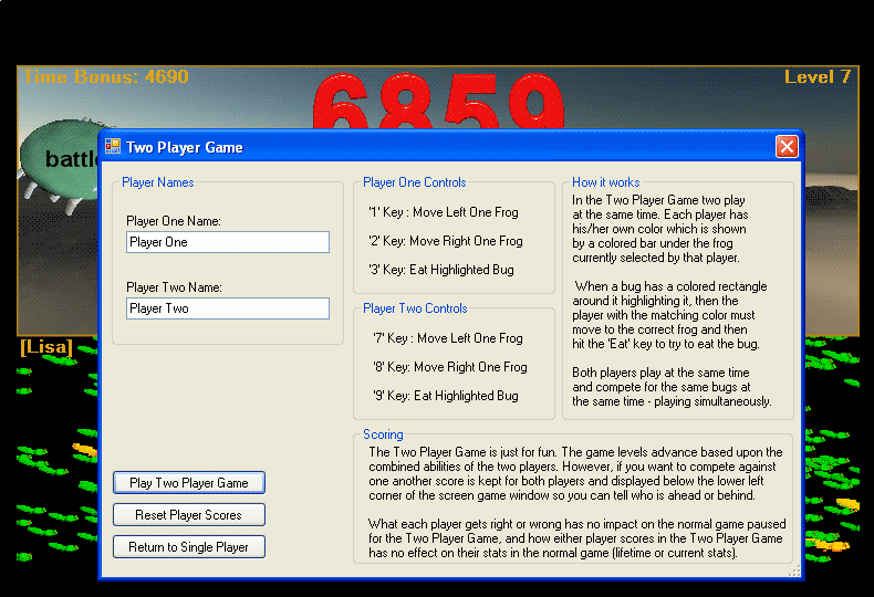 Frog Selection: As described in the screen capture, in the two player game two players play simultaneously using the keyboard. Player One uses the '1', '2', and '3' keys to control his or her 'frog cursor' which is the colored bar under the frog. Player Two uses the '7', '8', and '9' keys to control his frog cursor. Both players can be on the same frog at the same time, and both players can simultaneously eat with the same frog or different frogs. Only ONE frog can eat any bug at any time however, so when a bug is selected for both players only one player will be able to eat it.